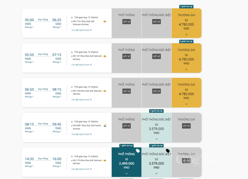 Cụ thể, trên các nền tảng đặt vé trực tuyến cũng như tại đại lý, hạng vé phổ thông chặng bay trục chính Hà Nội - TP. Hồ Chí Minh vé dao động từ 3 - 3,7 triệu đồng/chặng (tương đương 6 - 6,5 triệu đồng/khứ hồi, tăng khoảng 40%); chặng Hà Nội - Phú Quốc dao động từ 4,6 - 5,5 triệu đồng/chặng (tương đương 9,2 - 11 triệu đồng/khứ hồi, tăng khoảng 35%); chặng Hà Nội - Nha Trang ở mức 3,7 - 4,9 triệu đồng/chặng (tương đương 7 - 10 triệu đồng/khứ hồi, tăng khoảng 40 - 50%); chặng Hà Nội - Đà Nẵng dao động từ 2,5 - 4 triệu đồng/chặng (tương đương 5 - 8 triệu đồng/khứ hồi, tăng khoảng 20 - 30%). Sở hữu mức giá “mềm” hơn so với các chặng bay khác, tuyến Hà Nội - Đà Nẵng nhanh chóng thu hút lượng lớn hành khách, đến hiện tại đã ghi nhận tình trạng “cháy vé” ở nhiều chuyến.