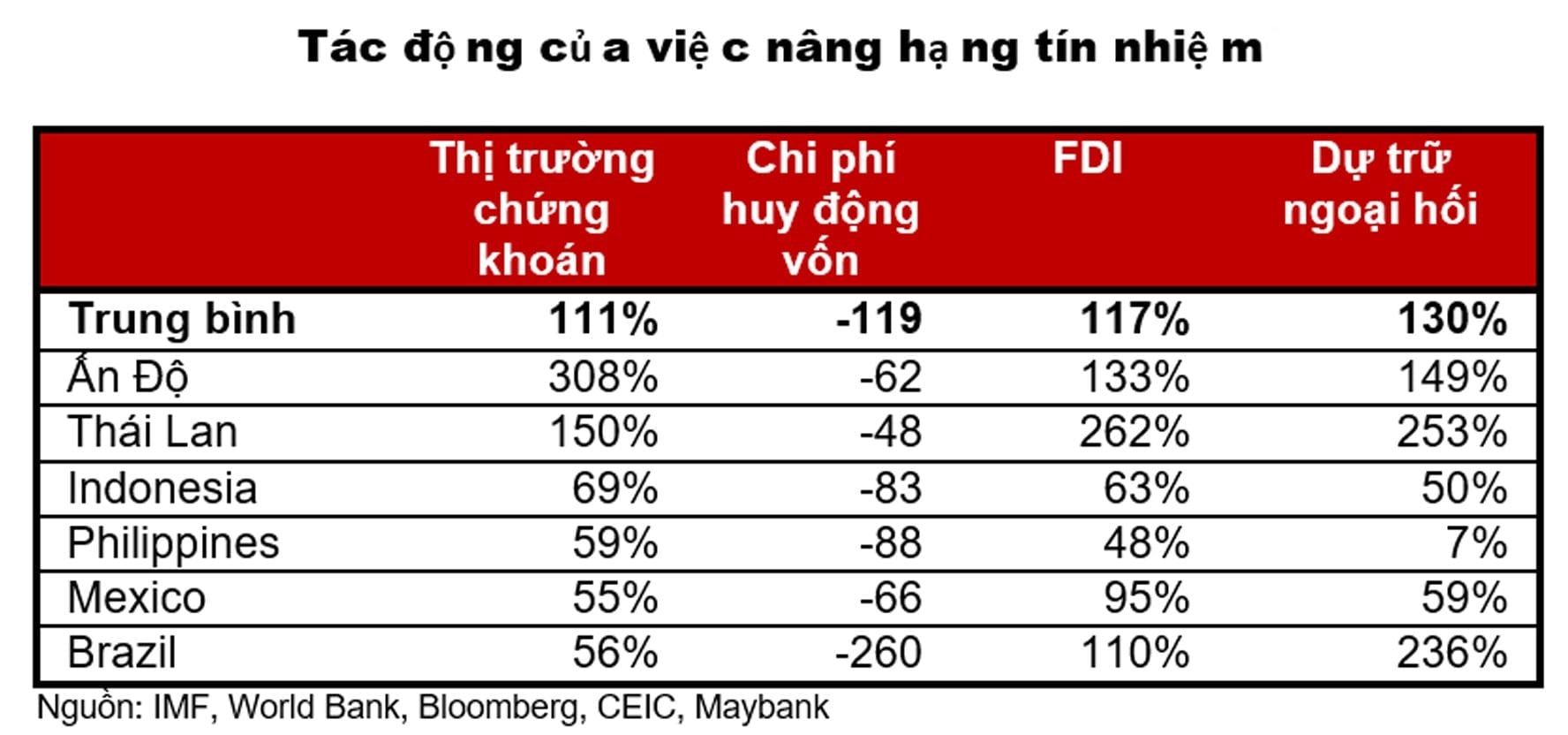 Theo VinaCapital, trong lịch sử, những quốc gia lần đầu tiên được nâng lên mức xếp hạng tín nhiệm mức Đầu tư thường ghi nhận mức tăng rất mạnh của thị trường chứng khoán trong giai đoạn xoay quanh thời điểm nâng hạng. Cụ thể, chỉ số chứng khoán của Ấn Độ tăng khoảng 308% và của Thái Lan tăng khoảng 150% khi tính từ 2 năm trước đến 2 năm sau thời điểm được nâng hạng.