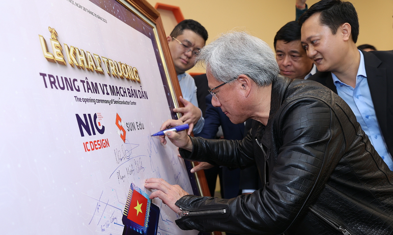 CEO Nvidia ký tên trên tấm bảng tại Trung tâm vi mạch bán dẫn mới thành lập. Ảnh: Lưu Quý
