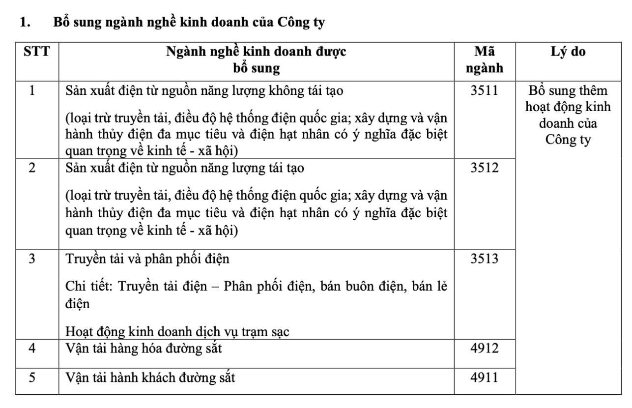 Ngoài ra, HĐQT Vinhomes cũng trình cổ đông thông qua việc bổ sung ngành nghề kinh doanh liên quan đến năng lượng và logistics, cụ thể là sản xuất điện, truyền tải và phân phối điện; vận tải hàng hoá và hành khách bằng đường sắt.