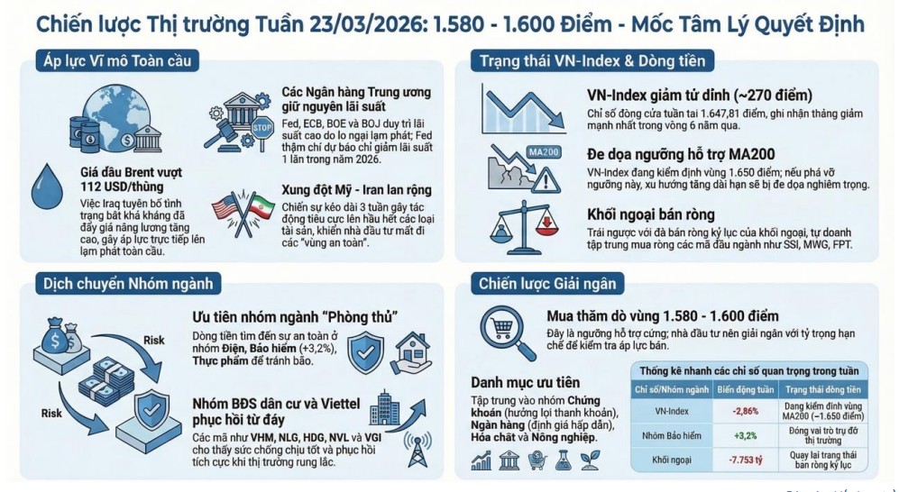 đã mất tổng cộng 12,4% giá trị – mức giảm sâu hơn phần lớn các thị trường trong khu vực châu Á. Kết thúc tuần giao dịch từ 16–21/3, VN-Index dừng tại 1.647,81 điểm, giảm 48,4 điểm (-2,86%), với áp lực chính đến từ nhóm cổ phiếu vốn hóa lớn như VIC (-15,7 điểm), BSR (-7,6 điểm), GAS (-5 điểm) và GVR (-2,8 điểm).