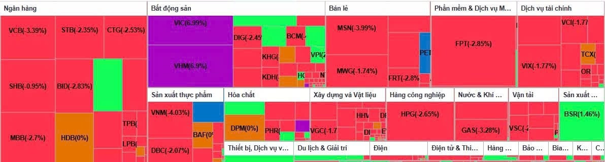 Xét theo ngành, bất động sản là điểm sáng hiếm hoi nhưng động lực chủ yếu vẫn đến từ các cổ phiếu Vingroup. Nhiều mã bất động sản khác tiếp tục điều chỉnh mạnh như DIG, DXG, BCM hay KBC giảm từ 2% đến trên 4%. Ngoài nhóm này, chỉ có dịch vụ tiêu dùng và hàng thiết yếu giữ được sắc xanh nhẹ, nhưng mức tăng không đáng kể.