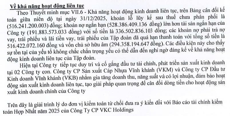 Những con số này cho thấy áp lực tài chính của VKC đang ở mức tương đối lớn. Đây cũng là một trong những cơ sở chính khiến đơn vị kiểm toán đưa ra cảnh báo về khả năng hoạt động liên tục của doanh nghiệp.