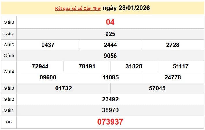 XSCT 28/1, KQXSCT 28/1. Xem lại kết quả xổ số Cần Thơ ngày 28/1/2026