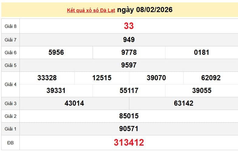 XSDL 8/2, KQXSDL 8/2. Xem lại kết quả xổ số Đà Lạt ngày 8/2/2026
