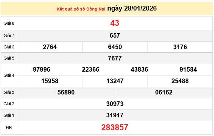 XSDN 28/1, KQXSDN 28/1. Xem lại kết quả xổ số Đồng Nai ngày 28/1/2026