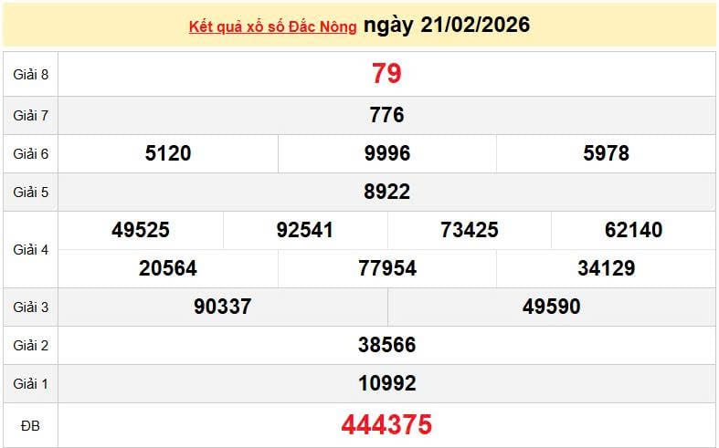 XSDNO 21/2, KQXSDNO 21/2. Xem lại kết quả xổ số Đắk Nông ngày 21/2/2026