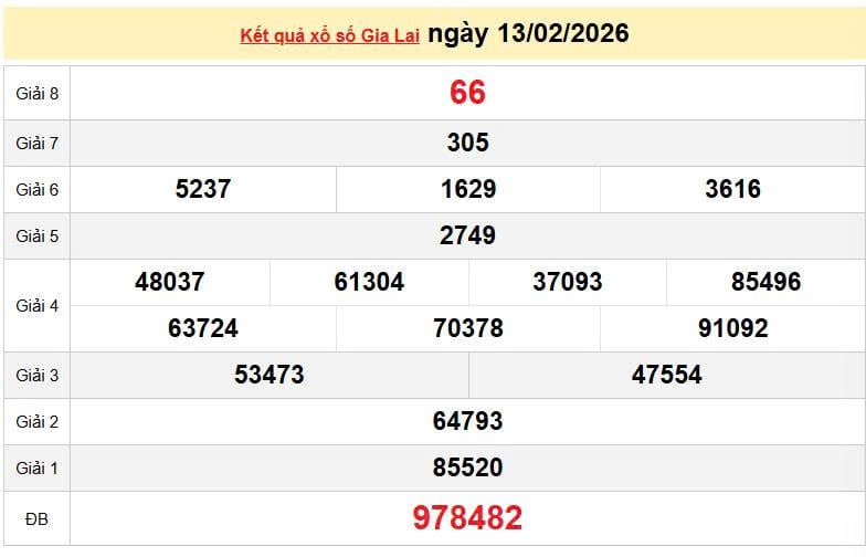 XSGL13/2, KQXSGL13/2. Xem lại kết quả xổ số Gia Lai ngày 13/2/2026