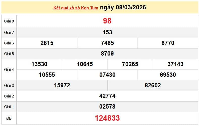 XSKT 8/3, KQXSKT 8/3. Xem lại kết quả xổ số Kon Tum ngày 8/3/2026
