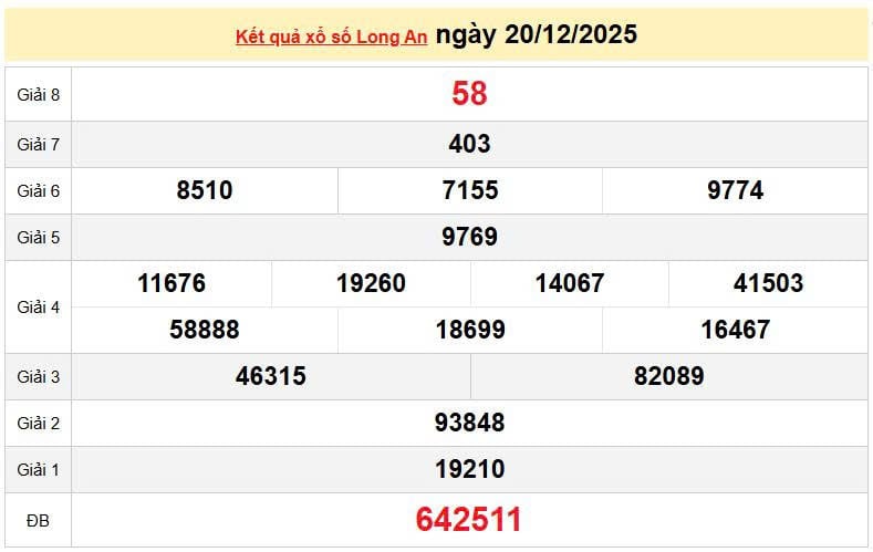 XSLA 20/12, KQXSLA 20/12. Xem lại kết quả xổ số Long An ngày 20/12/2025