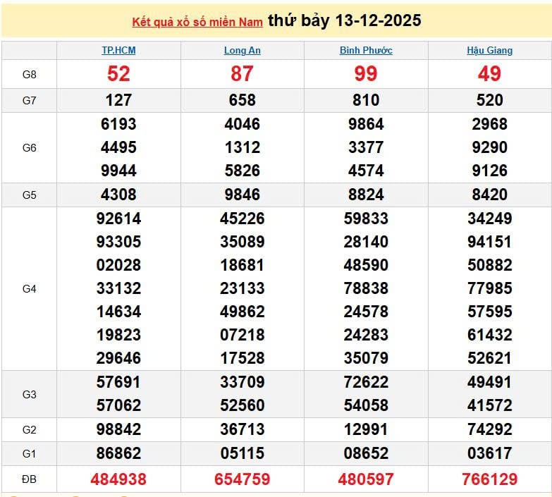 XSMN 13/12, KQXSMN 13/12. Xem lại kết quả xổ số miền Nam ngày 13/12/2025