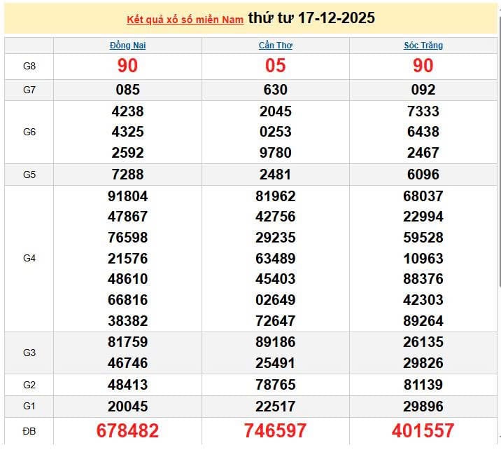 XSMN 17/12, KQXSMN 17/12. Xem lại kết quả xổ số miền Nam ngày 17/12/2025