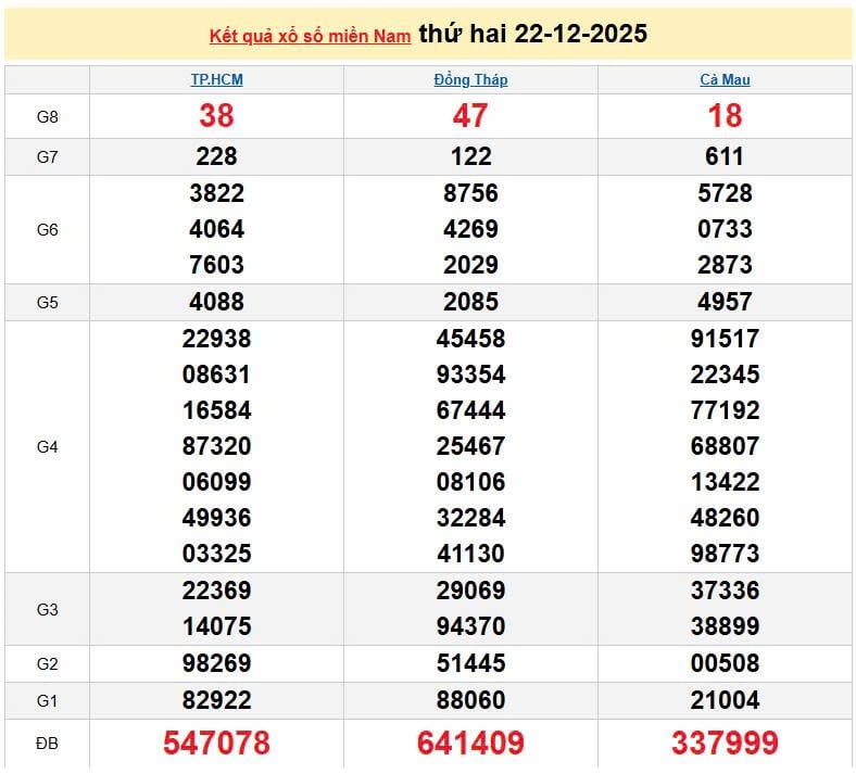 XSMN 22/12, KQXSMN 22/12. Xem lại kết quả xổ số miền Nam ngày 22/12/2025