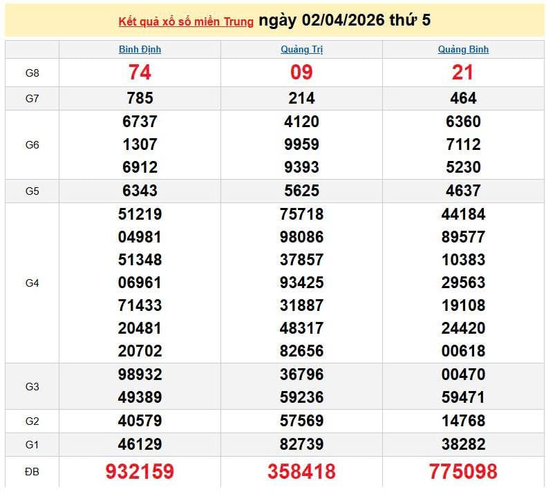 XSMT 2/4, KQXSMT 2/4. Xem lại kết quả xổ số miền Trung ngày 2/4/2026