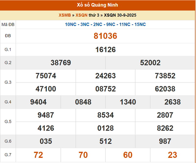 XSQN 30/9, KQXSQN 30/9. Xem lại kết quả xổ số Quảng Ninh ngày 30/9/2025