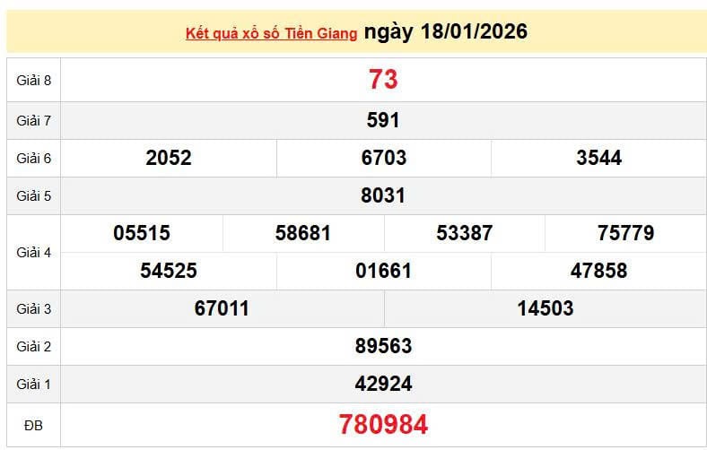 XSTG 18/1, KQXSTG 18/1. Xem lại kết quả xổ số Tiền Giang ngày 18/1/2026