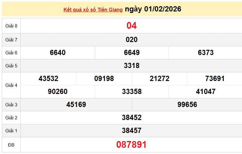 XSTG 8/2, KQXSTG 8/2. Xem lại kết quả xổ số Tiền Giang ngày 8/2/2026