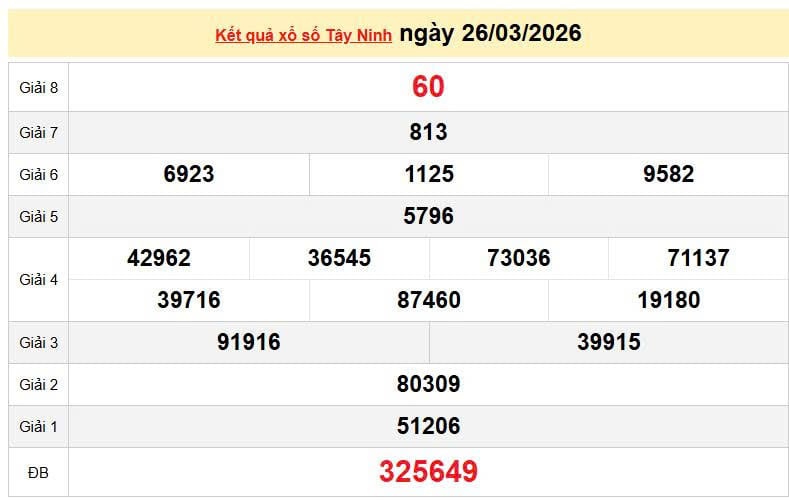 XSTN 26/3, KQXSTN 26/3 Xem lại kết quả xổ số Tây Ninh ngày 26/3/2026