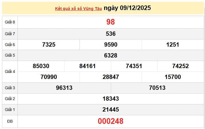 XSVT 16/12, KQXSVT 16/12. Xem lại kết quả xổ số Vũng Tàu ngày 16/12/2025